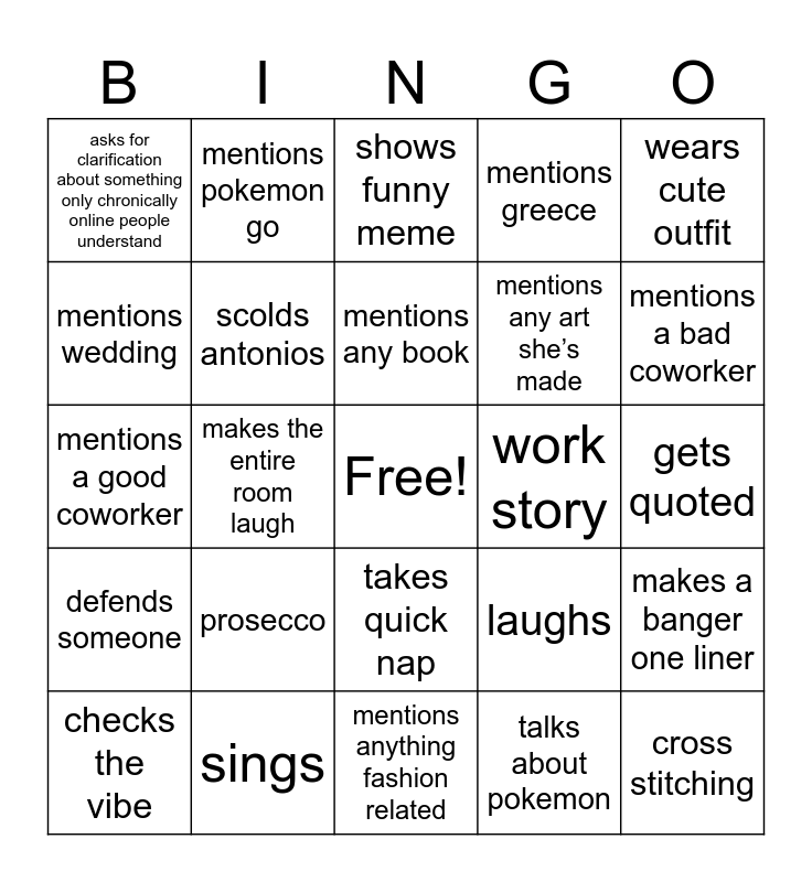 This bingo card has a free space and 24 words: prosecco, sings, mentions any book, checks the vibe, wears cute outfit, asks for clarification about something only chronically online people understand, mentions wedding, mentions pokemon go, work story, takes quick nap, mentions any art she’s made, mentions a good coworker, laughs, makes a banger one liner, scolds antonios, talks about pokemon, gets quoted, shows funny meme, mentions a bad coworker, makes the entire room laugh, cross stitching, defends someone, mentions greece and mentions anything fashion related.