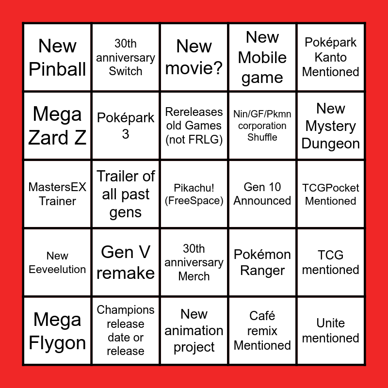 This bingo card has a free space and 29 words: Pokémon sleep Mentioned, Champions release date or release, New movie?, Lets Go, Poképark Kanto Mentioned, New Pinball, Poképark 3, Rereleases old Games (not FRLG), Gen 10 Announced, TCG mentioned, Mega Flygon, Trailer of all past gens, Café remix Mentioned, Unite mentioned, MastersEX Trainer, New spinoff announced, New animation project, Pokémon Ranger, New Mystery Dungeon, New Eeveelution, Gen V remake, Pokécenter Restock, Nin/GF/Pkmn corporation Shuffle, TCGPocket Mentioned, Mega Zard Z, 30th anniversary Switch, 30th anniversary Merch, New Mobile game and Pokémon Go Mentioned.