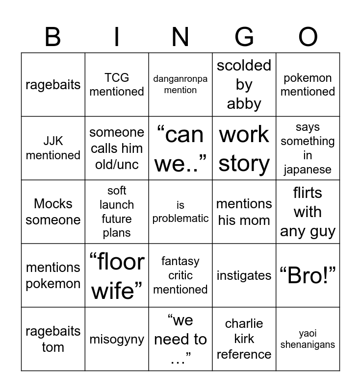This bingo card has a free space and 24 words: “floor wife”, misogyny, “can we..”, ragebaits tom, pokemon mentioned, ragebaits, JJK mentioned, TCG mentioned, mentions his mom, fantasy critic mentioned, work story, Mocks someone, instigates, “Bro!”, someone calls him old/unc, charlie kirk reference, flirts with any guy, danganronpa mention, says something in japanese, soft launch future plans, yaoi shenanigans, mentions pokemon, scolded by abby and “we need to …”.