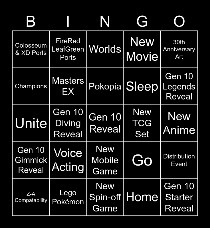 This bingo card has a free space and 24 words: Voice Acting, Lego Pokémon, Pokopia, Z-A Compatability, 30th Anniversary Art, Colosseum & XD Ports, Champions, FireRed LeafGreen Ports, New TCG Set, New Mobile Game, Sleep, Unite, Go, Distribution Event, Masters EX, Home, New Anime, Worlds, Gen 10 Legends Reveal, Gen 10 Diving Reveal, Gen 10 Starter Reveal, Gen 10 Gimmick Reveal, New Movie and New Spin-off Game.
