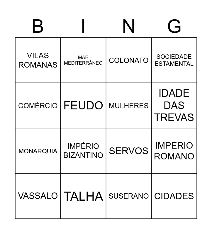 This bingo card has 29 words: Free!, FEUDALISMO, IMPERIO ROMANO, IMPERIO ISLÂMICO, VILAS ROMANAS, COLONATO, MULHERES, CRUZADAS, TALHA, CORVEIA, SUSERANO, VASSALO, POVOS BARBAROS, CONSTANTINOPLA, IMPÉRIO BIZANTINO, , IGREJA, NOBREZA, CIDADES, COMÉRCIO, SERVOS, VASSALAGEM, PESTE NEGRA, MONARQUIA, FEUDO, SOCIEDADE ESTAMENTAL, MAR MEDITERRÂNEO, ECONOMIA AGRÁRIA, IDADE DAS TREVAS and SUBSISTÊNCIA.