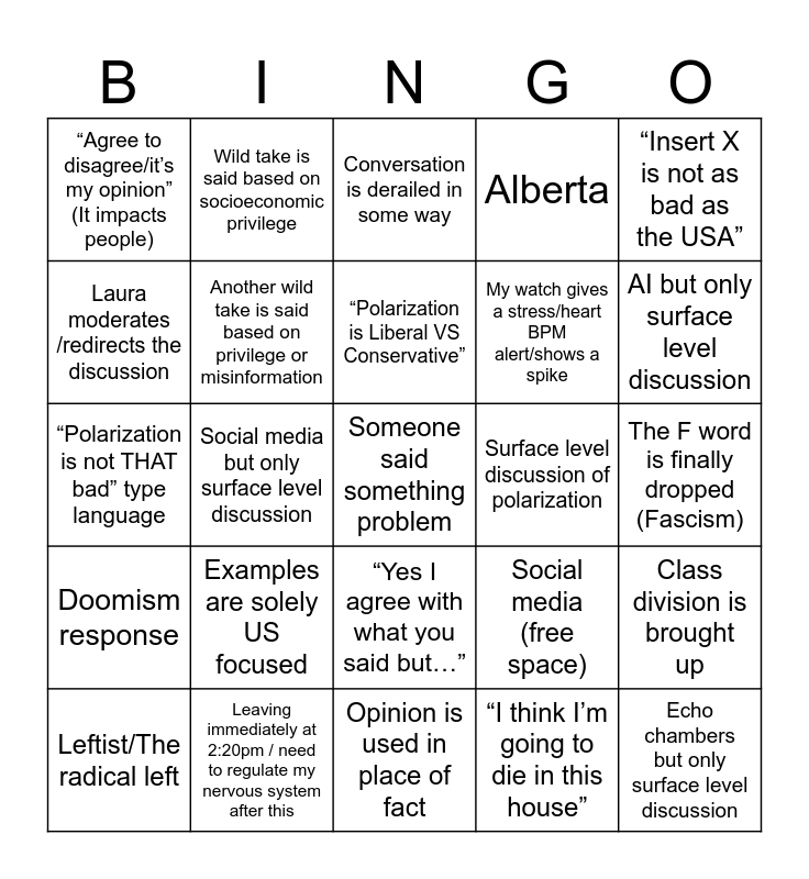 This bingo card has 25 words: Examples are solely US focused, Opinion is used in place of fact, “Polarization is Liberal VS Conservative”, Leftist/The radical left, “Insert X is not as bad as the USA”, “Agree to disagree/it’s my opinion” (It impacts people), Laura moderates /redirects the discussion, Wild take is said based on socioeconomic privilege, Surface level discussion of polarization, “Yes I agree with what you said but…”, My watch gives a stress/heart BPM alert/shows a spike, “Polarization is not THAT bad” type language, Social media (free space), Class division is brought up, Another wild take is said based on privilege or misinformation, Echo chambers but only surface level discussion, The F word is finally dropped (Fascism), Conversation is derailed in some way, AI but only surface level discussion, Social media but only surface level discussion, Someone said something problem, Leaving immediately at 2:20pm / need to regulate my nervous system after this, Doomism response, Alberta and “I think I’m going to die in this house”.