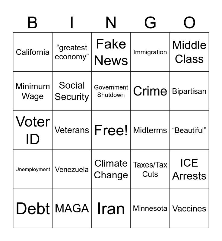 This bingo card has a free space and 48 words: Democracy, Vaccines, Ukraine/Russia, Iran, Venezuela, United Nations, “greatest economy”, Jobs, Minimum Wage, Healthcare, Social Security, Immigration, ICE Arrests, Taxes/Tax Cuts, Inflation, “most powerful military”, Government Shutdown, Midterms, Education, Middle Class, Veterans, Minnesota, California, Crime, American Dream, Bipartisan, Debt, Supreme Court, Climate Change, Unemployment, Abortion, Republicans, Democrats, God, MAGA, Trade/Tariffs, Dept. of War, “Beautiful”, Gas Prices, Liberal Media, America First, “very very special”, Fake News, Charlie Kirk, Voter ID, Big Beautiful Bill, Praises DHS and terrorism.