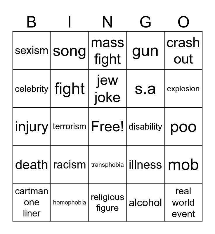 This bingo card has a free space and 24 words: racism, homophobia, jew joke, cartman one liner, crash out, sexism, celebrity, song, disability, transphobia, s.a, injury, illness, mob, fight, alcohol, poo, mass fight, explosion, terrorism, real world event, death, gun and religious figure.