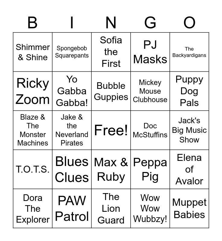 This bingo card has a free space and 24 words: Blues Clues, PAW Patrol, Bubble Guppies, Dora The Explorer, The Backyardigans, Shimmer & Shine, Ricky Zoom, Spongebob Squarepants, Doc McStuffins, Max & Ruby, Mickey Mouse Clubhouse, Blaze & The Monster Machines, Peppa Pig, Elena of Avalor, Yo Gabba Gabba!, Wow Wow Wubbzy!, Jack's Big Music Show, Sofia the First, Puppy Dog Pals, Jake & the Neverland Pirates, Muppet Babies, T.O.T.S., PJ Masks and The Lion Guard.
