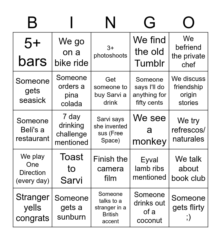 This bingo card has a free space and 24 words: Toast to Sarvi, Someone gets a sunburn, Get someone to buy Sarvi a drink, Stranger yells congrats, We befriend the private chef, 5+ bars, Someone gets seasick, We go on a bike ride, We see a monkey, Finish the camera film, Someone says I'll do anything for fifty cents, Someone Beli's a restaurant, Eyval lamb ribs mentioned, We talk about book club, Someone orders a pina colada, Someone drinks out of a coconut, We try refrescos/ naturales, 3+ photoshoots, We discuss friendship origin stories, 7 day drinking challenge mentioned, Someone gets flirty ;), We play One Direction (every day), We find the old Tumblr and Someone talks to a stranger in a British accent.