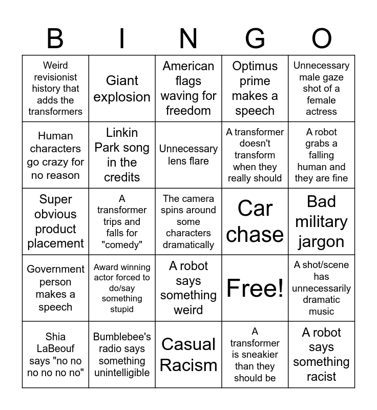 This bingo card has 25 words: Award winning actor forced to do/say something stupid, Casual Racism, Unnecessary lens flare, Shia LaBeouf says "no no no no no no", Unnecessary male gaze shot of a female actress, Weird revisionist history that adds the transformers, Human characters go crazy for no reason, Giant explosion, Car chase, A robot says something weird, A transformer doesn't transform when they really should, Super obvious product placement, Free!, A shot/scene has unnecessarily dramatic music, Linkin Park song in the credits, A robot says something racist, Bad military jargon, American flags waving for freedom, A robot grabs a falling human and they are fine, A transformer trips and falls for "comedy", The camera spins around some characters dramatically, Bumblebee's radio says something unintelligible, Government person makes a speech, Optimus prime makes a speech and A transformer is sneakier than they should be.