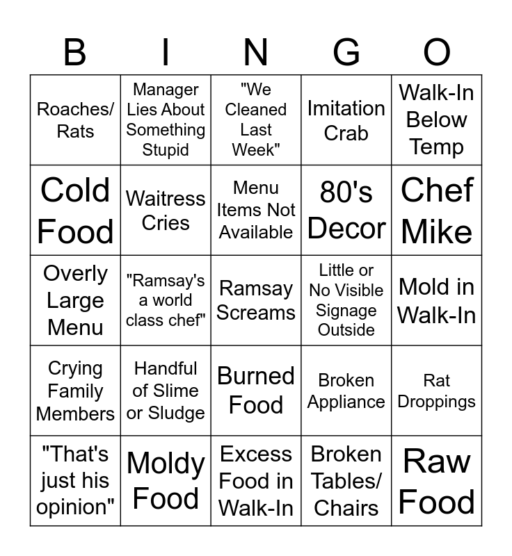 This bingo card has a free space and 24 words: Handful of Slime or Sludge, Moldy Food, Menu Items Not Available, "That's just his opinion", Walk-In Below Temp, Roaches/ Rats, Cold Food, Manager Lies About Something Stupid, Little or No Visible Signage Outside, Burned Food, 80's Decor, Overly Large Menu, Broken Appliance, Rat Droppings, Waitress Cries, Broken Tables/ Chairs, Mold in Walk-In, "We Cleaned Last Week", Chef Mike, "Ramsay's a world class chef", Raw Food, Crying Family Members, Imitation Crab and Excess Food in Walk-In.
