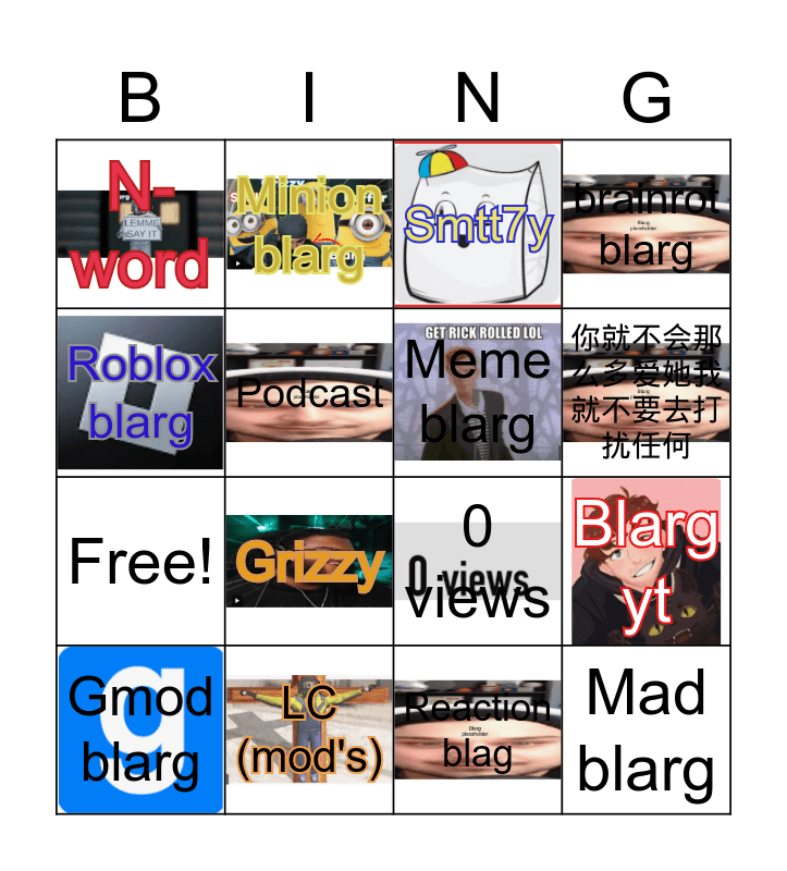 This bingo card has 18 images and 20 words: Blarg yt, Loud mic, Smtt7y, Blarg gta5, Gmod blarg, Roblox blarg, LC (mod's), N-word, Free!, Minion blarg, Grizzy, 0 views, Podcast, Mad blarg, Meme blarg, Blarg incident, 你就不会那么多爱她我就不要去打扰任何, brainrot blarg, Reaction blag and Pablo.