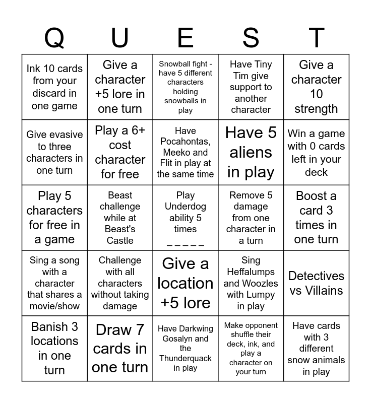This bingo card has a free space and 24 words: Challenge with all characters without taking damage, Draw 7 cards in one turn, Have Pocahontas, Meeko and Flit in play at the same time, Banish 3 locations in one turn, Give a character 10 strength, Ink 10 cards from your discard in one game, Give evasive to three characters in one turn, Give a character +5 lore in one turn, Remove 5 damage from one character in a turn, Give a location +5 lore, Have 5 aliens in play, Play 5 characters for free in a game, Sing Heffalumps and Woozles with Lumpy in play, Detectives vs Villains, Play a 6+ cost character for free, Make opponent shuffle their deck, ink, and play a character on your turn, Boost a card 3 times in one turn, Snowball fight - have 5 different characters holding snowballs in play, Win a game with 0 cards left in your deck, Beast challenge while at Beast's Castle, Have cards with 3 different snow animals in play, Sing a song with a character that shares a movie/show, Have Tiny Tim give support to another character and Have Darkwing Gosalyn and the Thunderquack in play.
