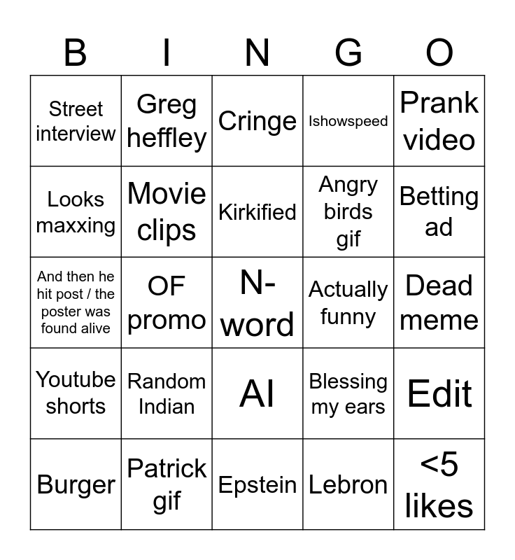 This bingo card has a free space and 24 words: Random Indian, Patrick gif, Kirkified, Burger, Prank video, Street interview, Looks maxxing, Greg heffley, Actually funny, AI, Angry birds gif, And then he hit post / the poster was found alive, Blessing my ears, Edit, Movie clips, Lebron, Dead meme, Cringe, Betting ad, OF promo, <5 likes, Youtube shorts, Ishowspeed and Epstein.