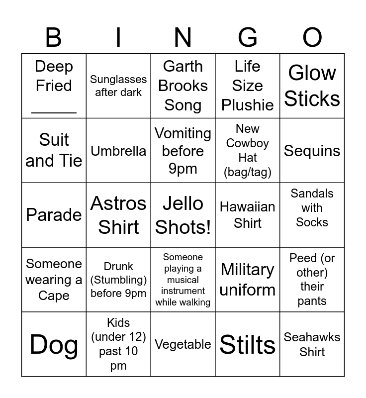 This bingo card has a free space and 24 words: Drunk (Stumbling) before 9pm, Kids (under 12) past 10 pm, Vomiting before 9pm, Dog, Glow Sticks, Deep Fried _____, Suit and Tie, Sunglasses after dark, Hawaiian Shirt, Someone playing a musical instrument while walking, New Cowboy Hat (bag/tag), Parade, Military uniform, Peed (or other) their pants, Umbrella, Stilts, Sandals with Socks, Garth Brooks Song, Sequins, Astros Shirt, Seahawks Shirt, Someone wearing a Cape, Life Size Plushie and Vegetable.
