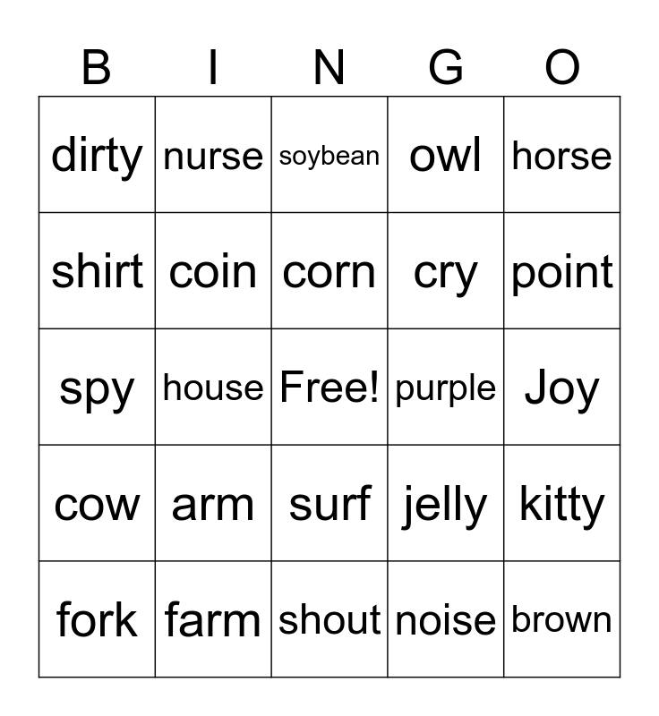 This bingo card has a free space and 24 words: arm, farm, corn, fork, horse, dirty, shirt, nurse, purple, surf, cry, spy, jelly, kitty, coin, noise, Joy, soybean, point, house, brown, cow, owl and shout.