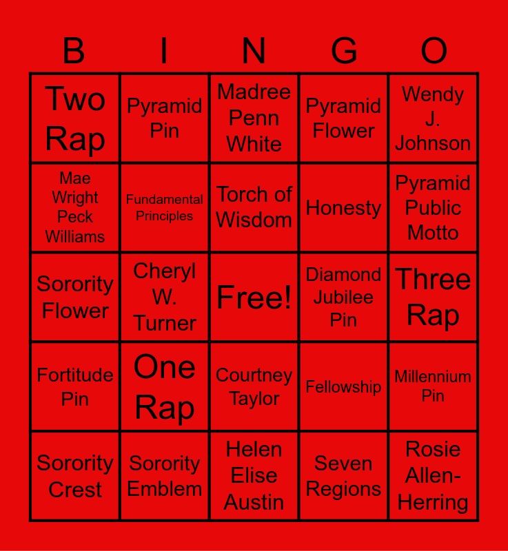 This bingo card has a free space and 27 words: Fellowship, Fidelity, Honesty, Helen Elise Austin, Mae Wright Peck Williams, Madree Penn White, Pyramid Pin, Fortitude Pin, Diamond Jubilee Pin, Millennium Pin, Sorority Flower, Pyramid Flower, Sorority Crest, Sorority Emblem, Pyramid Public Motto, Sacred Vow, Fundamental Principles, Torch of Wisdom, One Rap, Two Rap, Three Rap, Seven Regions, Cheryl W. Turner, Rosie Allen-Herring, Courtney Taylor, Wendy J. Johnson and Rosalyn Glenn.