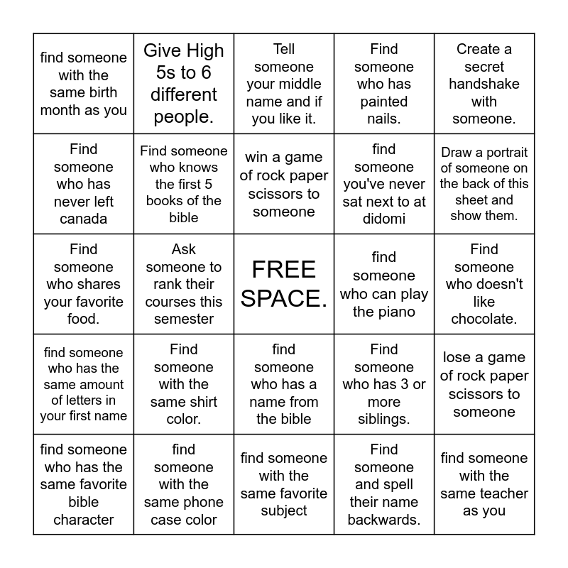 This bingo card has a free space and 24 words: Find someone with the same shirt color., find someone with the same phone case color, win a game of rock paper scissors to someone, find someone who has the same favorite bible character, Create a secret handshake with someone., find someone with the same birth month as you, Find someone who has never left canada, Give High 5s to 6 different people., find someone who can play the piano, find someone who has a name from the bible, find someone you've never sat next to at didomi, Find someone who shares your favorite food., Find someone who has 3 or more siblings., lose a game of rock paper scissors to someone, Find someone who knows the first 5 books of the bible, Find someone and spell their name backwards., Find someone who doesn't like chocolate., Tell someone your middle name and if you like it., Draw a portrait of someone on the back of this sheet and show them., Ask someone to rank their courses this semester, find someone with the same teacher as you, find someone who has the same amount of letters in your first name, Find someone who has painted nails. and find someone with the same favorite subject.