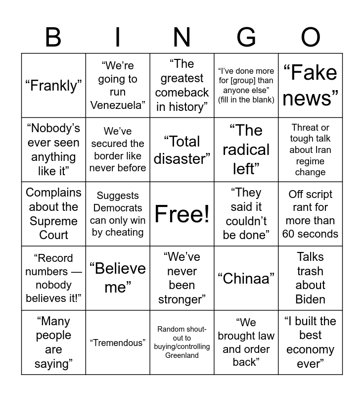 This bingo card has a free space and 24 words: “Believe me”, “Tremendous”, “Total disaster”, “Many people are saying”, “Fake news”, “Frankly”, “Nobody’s ever seen anything like it”, “We’re going to run Venezuela”, “They said it couldn’t be done”, “We’ve never been stronger”, “The radical left”, Complains about the Supreme Court, “Chinaa”, Talks trash about Biden, We’ve secured the border like never before, “We brought law and order back”, Off script rant for more than 60 seconds, “The greatest comeback in history”, Threat or tough talk about Iran regime change, Suggests Democrats can only win by cheating, “I built the best economy ever”, “Record numbers — nobody believes it!”, “I’ve done more for [group] than anyone else” (fill in the blank) and Random shout-out to buying/controlling Greenland.