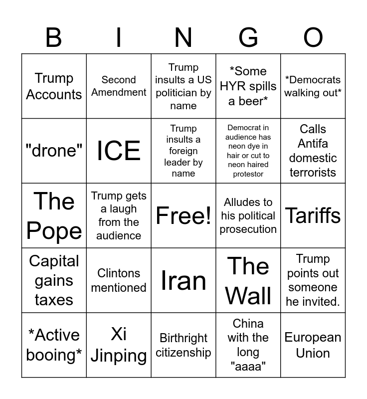 This bingo card has a free space and 34 words: Russia, China with the long "aaaa", Putin, Ukraine, Capital gains taxes, ICE, *Democrats walking out*, *Active booing*, Second Amendment, Venezuela, Trump insults a foreign leader by name, Trump insults a US politician by name, Trump insults some 3rd world country, Alludes to assassination attempt, Alludes to his political prosecution, Calls Antifa domestic terrorists, Xi Jinping, The Pope, Clintons mentioned, The Wall, Iran, One Big Beautiful Bill, Trump Accounts, Tariffs, Birthright citizenship, European Union, *Some HYR spills a beer*, Camera pans to someone asleep, Democrat in audience has neon dye in hair or cut to neon haired protestor, "drone", That hand motion he likes to do, Trump gets a laugh from the audience, Trump points out someone he invited. and Camera cuts to Zuckerberg or Musk in attendance.