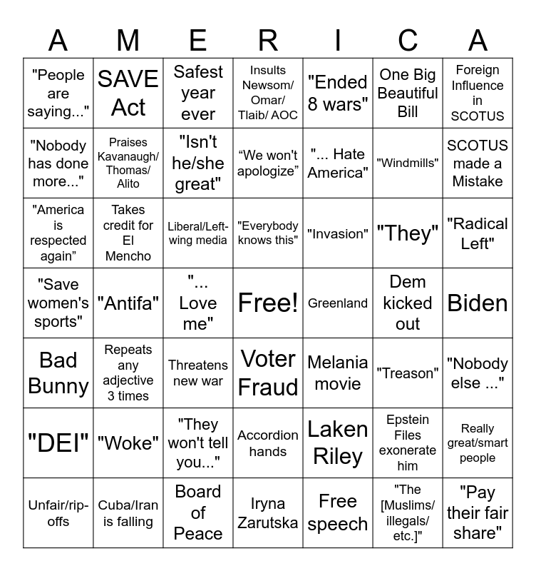 This bingo card has a free space and 48 words: Laken Riley, "Windmills", Iryna Zarutska, "Antifa", Liberal/Left-wing media, Biden, SAVE Act, Cuba/Iran is falling, One Big Beautiful Bill, Voter Fraud, Foreign Influence in SCOTUS, Insults Newsom/ Omar/ Tlaib/ AOC, "They", "Invasion", "DEI", Dem kicked out, "Nobody has done more...", SCOTUS made a Mistake, Epstein Files exonerate him, "Ended 8 wars", "... Hate America", "... Love me", "People are saying...", Praises Kavanaugh/ Thomas/ Alito, Really great/smart people, "Isn't he/she great", "Radical Left", Unfair/rip-offs, "Everybody knows this", Takes credit for El Mencho, "The [Muslims/ illegals/ etc.]", Greenland, "Nobody else ...", "Woke", "Save women's sports", Melania movie, "Treason", "America is respected again”, Threatens new war, "They won't tell you...", Bad Bunny, "Pay their fair share", Safest year ever, Board of Peace, “We won't apologize”, Accordion hands, Repeats any adjective 3 times and Free speech.