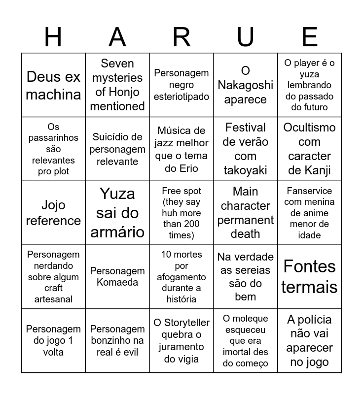 This bingo card has a free space and 24 words: Personagem do jogo 1 volta, Personagem Komaeda, Música de jazz melhor que o tema do Erio, O moleque esqueceu que era imortal des do começo, O player é o yuza lembrando do passado do futuro, Deus ex machina, Seven mysteries of Honjo mentioned, Personagem negro esteriotipado, Main character permanent death, Fanservice com menina de anime menor de idade, Jojo reference, Suicídio de personagem relevante, Na verdade as sereias são do bem, Fontes termais, Os passarinhos são relevantes pro plot, Personagem bonzinho na real é evil, O Storyteller quebra o juramento do vigia, O Nakagoshi aparece, Ocultismo com caracter de Kanji, Personagem nerdando sobre algum craft artesanal, Yuza sai do armário, 10 mortes por afogamento durante a história, Festival de verão com takoyaki and A polícia não vai aparecer no jogo.