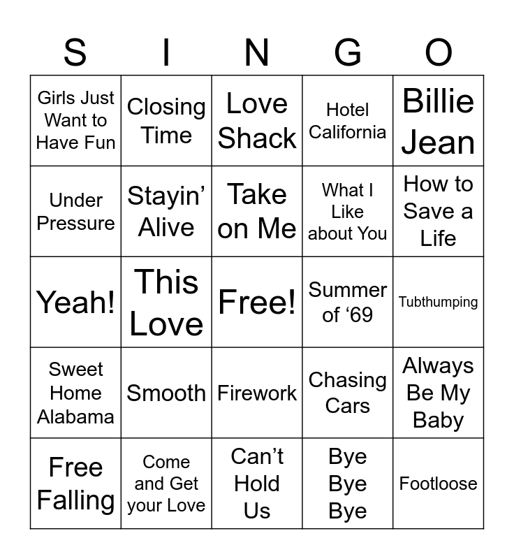 This bingo card has a free space and 62 words: September, Come and Get your Love, Best of My Love, Sweet Home Alabama, Take Me Home, Country Roads, Lovely Day, Stayin’ Alive, Dancing Queen, What I Like about You, Sweet Caroline, Hotel California, Don’t Stop Believing, Under Pressure, I Wanna Dance with Somebody, Your Love, Girls Just Want to Have Fun, Footloose, Billie Jean, Should I Stay or Should I Go, Take on Me, Summer of ‘69, Love Shack, Free Falling, Bye Bye Bye, I Want it That Way, Gettin’ Jiggy Wit it, Waterfalls, Wannabe, Always Be My Baby, Kiss Me, Mr. Jones, Soul Sister, Ironic, Torn, Tubthumping, Closing Time, Better Together, Yellow, This Love, Party in the USA, Yeah!, Wherever you Will Go, Smooth, Since U Been Gone, How to Save a Life, Chasing Cars, I’m Yours, Single Ladies, Shape of You, Just the Way You Are, Firework, Can’t Hold Us, We Found Love, Uptown Funk, Riptide, Handclap, Wrecking Ball, Haven’t Met You Yet, We Are Young, Call Me Maybe, Shut up and Dance and I Will Wait.