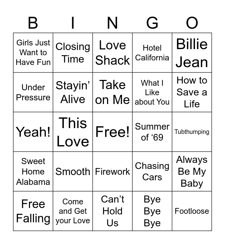This bingo card has a free space and 62 words: September, Come and Get your Love, Best of My Love, Sweet Home Alabama, Take Me Home, Country Roads, Lovely Day, Stayin’ Alive, Dancing Queen, What I Like about You, Sweet Caroline, Hotel California, Don’t Stop Believing, Under Pressure, I Wanna Dance with Somebody, Your Love, Girls Just Want to Have Fun, Footloose, Billie Jean, Should I Stay or Should I Go, Take on Me, Summer of ‘69, Love Shack, Free Falling, Bye Bye Bye, I Want it That Way, Gettin’ Jiggy Wit it, Waterfalls, Wannabe, Always Be My Baby, Kiss Me, Mr. Jones, Soul Sister, Ironic, Torn, Tubthumping, Closing Time, Better Together, Yellow, This Love, Party in the USA, Yeah!, Wherever you Will Go, Smooth, Since U Been Gone, How to Save a Life, Chasing Cars, I’m Yours, Single Ladies, Shape of You, Just the Way You Are, Firework, Can’t Hold Us, We Found Love, Uptown Funk, Riptide, Handclap, Wrecking Ball, Haven’t Met You Yet, We Are Young, Call Me Maybe, Shut up and Dance and I Will Wait.
