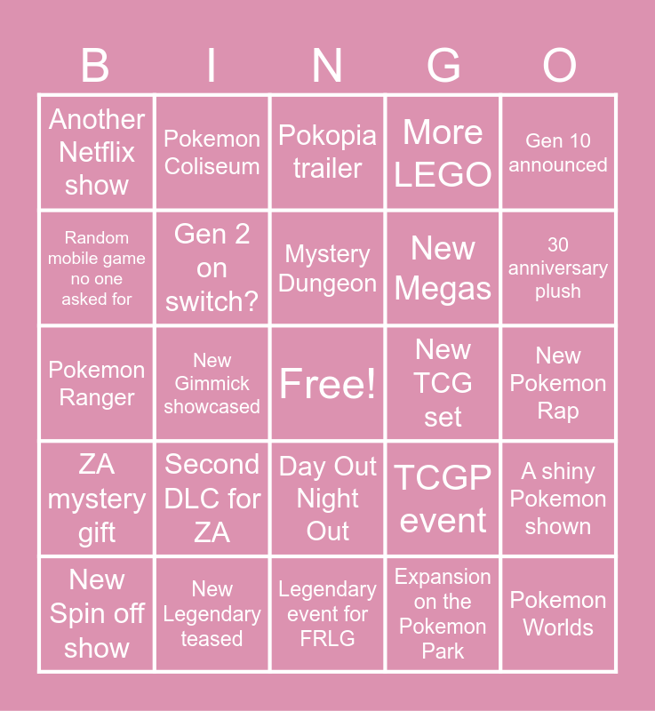 This bingo card has a free space and 24 words: Second DLC for ZA, New Legendary teased, Mystery Dungeon, New Spin off show, Gen 10 announced, Another Netflix show, Random mobile game no one asked for, Pokemon Coliseum, New TCG set, Day Out Night Out, New Megas, Pokemon Ranger, TCGP event, A shiny Pokemon shown, Gen 2 on switch?, Expansion on the Pokemon Park, New Pokemon Rap, Pokopia trailer, 30 anniversary plush, New Gimmick showcased, Pokemon Worlds, ZA mystery gift, More LEGO and Legendary event for FRLG.