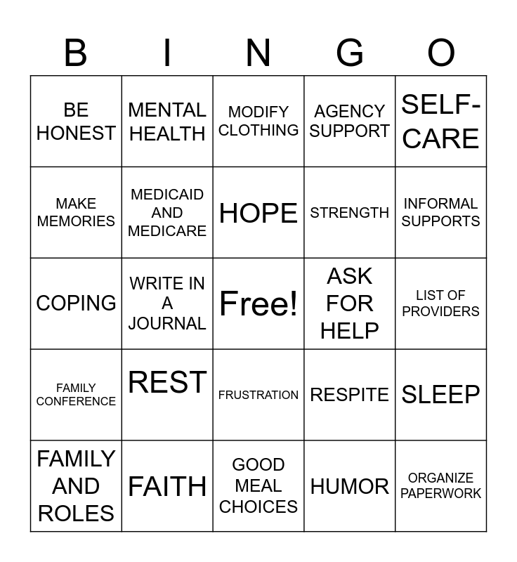 This bingo card has a free space and 24 words: REST, FAITH, HOPE, FAMILY AND ROLES, SELF-CARE, BE HONEST, MAKE MEMORIES, MENTAL HEALTH, ASK FOR HELP, FRUSTRATION, STRENGTH, COPING, RESPITE, SLEEP, MEDICAID AND MEDICARE, HUMOR, LIST OF PROVIDERS, MODIFY CLOTHING, INFORMAL SUPPORTS, WRITE IN A JOURNAL, ORGANIZE PAPERWORK, FAMILY CONFERENCE, AGENCY SUPPORT and GOOD MEAL CHOICES.