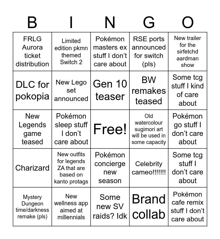 This bingo card has a free space and 24 words: New outfits for legends ZA that are based on kanto protags, New wellness app aimed at millennials, Gen 10 teaser, Mystery Dungeon time/darkness remake (pls), New trailer for the sirfetchd aardman show, FRLG Aurora ticket distribution, DLC for pokopia, Limited edition pkmn themed Switch 2, Old watercolour sugimori art will be used in some capacity, Pokémon concierge new season, BW remakes teased, New Legends game teased, Celebrity cameo!!!!!!!, Some tcg stuff I don’t care about, New Lego set announced, Brand collab, Pokémon go stuff I don’t care about, Pokémon masters ex stuff I don’t care about, Some tcg stuff I kind of care about, Pokémon sleep stuff I don’t care about, Pokémon cafe remix stuff I don’t care about, Charizard, RSE ports announced for switch (pls) and Some new SV raids? Idk.