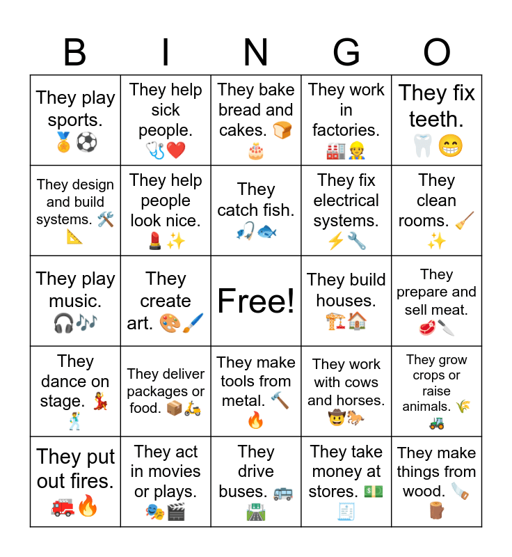 This bingo card has a free space and 30 words: They act in movies or plays. ππ¬, They study old cultures and ruins. πΊπ, They create art. π¨ποΈ, They travel and work in space. ππ, They play sports. π β½, They bake bread and cakes. ππ, They help people look nice. πβ¨, They make tools from metal. π¨π₯, They build houses. ποΈπ , They drive buses. ππ£οΈ, They prepare and sell meat. π₯©πͺ, They make things from wood. πͺπͺ΅, They take money at stores. π΅π§Ύ, They cook food. π¨βπ³π², They clean rooms. π§Ήβ¨, They make people laugh. π€‘π, They work with cows and horses. π€ π, They dance on stage. ππΊ, They deliver packages or food. π¦π΅, They fix teeth. π¦·π, They play music. π§πΆ, They work underwater. π€Ώπ, They help sick people. π©Ίβ€οΈ, They fix electrical systems. β‘π§, They design and build systems. π οΈπ, They work in factories. ππ·, They grow crops or raise animals. πΎπ, They put out fires. ππ₯, They catch fish. π£π and They help people on planes. βοΈπ.