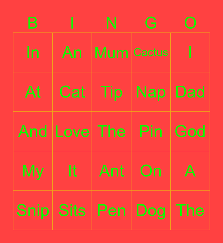 This bingo card has a free space and 24 words: It, Sits, Tip, Snip, I, In, At, An, Pin, Ant, Nap, And, On, A, Cat, Dog, God, Mum, Dad, Love, The, My, Cactus and Pen.