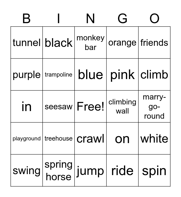 This bingo card has a free space and 29 words: swing, slide, seesaw, sandbox, tunnel, monkey bar, trampoline, treehouse, climbing wall, spring horse, marry-go-round, spin, jump, ride, climb, play, crawl, playground, friends, in, on, green, pink, purple, orange, black, white, blue and yellow.