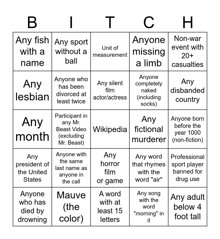This bingo card has a free space and 38 words: Convicted Pedophile (not Epstein or Maxwell), Article with no vowels in its name, Modern Brainrot, Anyone who has been divorced at least twice, Professional sport player banned for drug use, Anyone with the same last name as anyone in the call, Any silent film actor/actress, Any plane crash, Non-war event with 20+ casualties, Anyone completely naked (including socks), Participant in any Mr. Beast Video (excluding Mr. Beast), Anyone missing a limb, Any adult below 4 foot tall, Anyone born before the year 1000 (non-fiction), Any lesbian, Any president of the United States, Anyone who died by assassination (other than Kirk), Unit of measurement, Extinct SPECIES of animal, Any fictional murderer, Any fish with a name, Mauve (the color), Any disbanded country, Anyone who has died by drowning, The oldest person alive, A word with at least 15 letters, Any palindrome with at least 4 letters, Any movie with an actor playing themself, Anyone who is 400+ pounds, Any fictional coach, Any drummer in a band, Any horror film or game, Any song with the word "morning" in it, Any sport without a ball, Any musician who has headlined a Superbowl Halftime show, Any word that rhymes with the word "air", Any month and Any rapper.