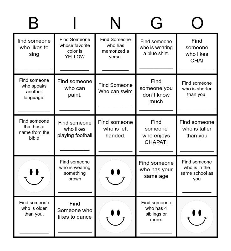 This bingo card has 4 images and 21 words: Find Someone who likes to dance ___________, Find someone who is left handed. ___________, Find someone who has 4 siblings or more. ____________, Find someone who likes CHAI ___________, find someone who likes to sing ___________, Find Someone whose favorite color is YELLOW ___________, Find Someone who has memorized a verse. __________, Find someone who enjoys CHAPATI ___________, Find someone who is in the same school as you ___________, Find someone who speaks another language. ____________, Find someone who can paint. __________, Find someone who has your same age ___________, Find someone who is shorter than you. _____________, Find someone who is older than you. ___________, Find someone who likes playing football __________, Find Someone Who can swim ___________, Find someone you don´t know much ___________, Find someone who is taller than you ___________, Find someone that has a name from the bible ___________, Find someone who is wearing something brown _____________ and Find someone who is wearing a blue shirt. ____________.