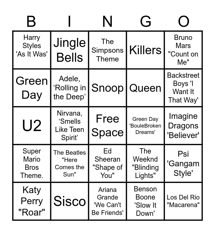 This bingo card has a free space and 31 words: Ariana Grande 'We Can't Be Friends', Carly Rae Jepson "Call Me Maybe", Nirvana, ‘Smells Like Teen Spirit’, Billie Eilish 'Bad Guy', Harry Styles 'As It Was', The Simpsons Theme, Adele, ‘Rolling in the Deep’, The Weeknd "Blinding Lights", Green Day 'BouleBroken Dreams', Benson Boone 'Slow It Down', Imagine Dragons 'Believer', Los Del Rio "Macarena", Surfaces 'Sunday Best', Star Wars Theme, Backstreet Boys 'I Want It That Way', Queen "We Will Rock You", Psi 'Gangam Style', The Beatles "Here Comes the Sun", Super Mario Bros Theme., Ed Sheeran "Shape of You", Bruno Mars "Count on Me", Taylor Swift "Shake It Off", Katy Perry "Roar", Jingle Bells, Queen, Green Day, Killers, U2, Sisco, Snoop and Kanye.
