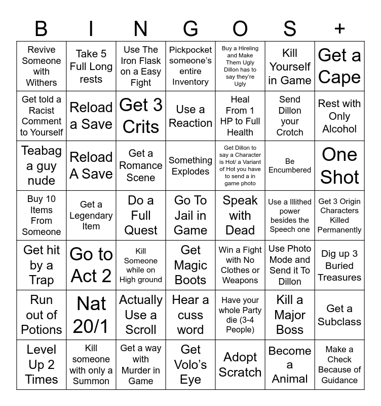 This bingo card has 49 words: Kill a Major Boss, Send Dillon your Crotch, Adopt Scratch, Get a Legendary Item, Get a Romance Scene, Get 3 Origin Characters Killed Permanently, Take 5 Full Long rests, Get a way with Murder in Game, Kill Yourself in Game, Get Magic Boots, Get a Cape, Pickpocket someone’s entire Inventory, Be Encumbered, Get Dillon to say a Character is Hot/ a Variant of Hot you have to send a in game photo, Nat 20/1, Use a Illithed power besides the Speech one, Get told a Racist Comment to Yourself, Rest with Only Alcohol, Get a Subclass, Buy a Hireling and Make Them Ugly Dillon has to say they’re Ugly, Heal From 1 HP to Full Health, Do a Full Quest, Revive Someone with Withers, Reload a Save, Level Up 2 Times, Get 3 Crits, One Shot, Kill someone with only a Summon, Something Explodes, Reload A Save, Make a Check Because of Guidance, Speak with Dead, Run out of Potions, Actually Use a Scroll, Buy 10 Items From Someone, Win a Fight with No Clothes or Weapons, Use Photo Mode and Send it To Dillon, Dig up 3 Buried Treasures, Teabag a guy nude, Kill Someone while on High ground, Hear a cuss word, Get hit by a Trap, Go To Jail in Game, Get Volo’s Eye, Use a Reaction, Use The Iron Flask on a Easy Fight, Have your whole Party die (3-4 People), Go to Act 2 and Become a Animal.