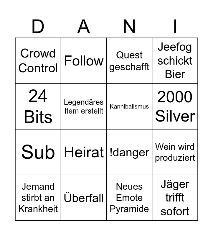 This bingo card has 16 words: Überfall, Wein wird produziert, Quest geschafft, Crowd Control, Sub, Follow, !danger, Neues Emote Pyramide, 24 Bits, Legendäres Item erstellt, Jemand stirbt an Krankheit, Jeefog schickt Bier, Heirat, 2000 Silver, Kannibalismus and Jäger trifft sofort.
