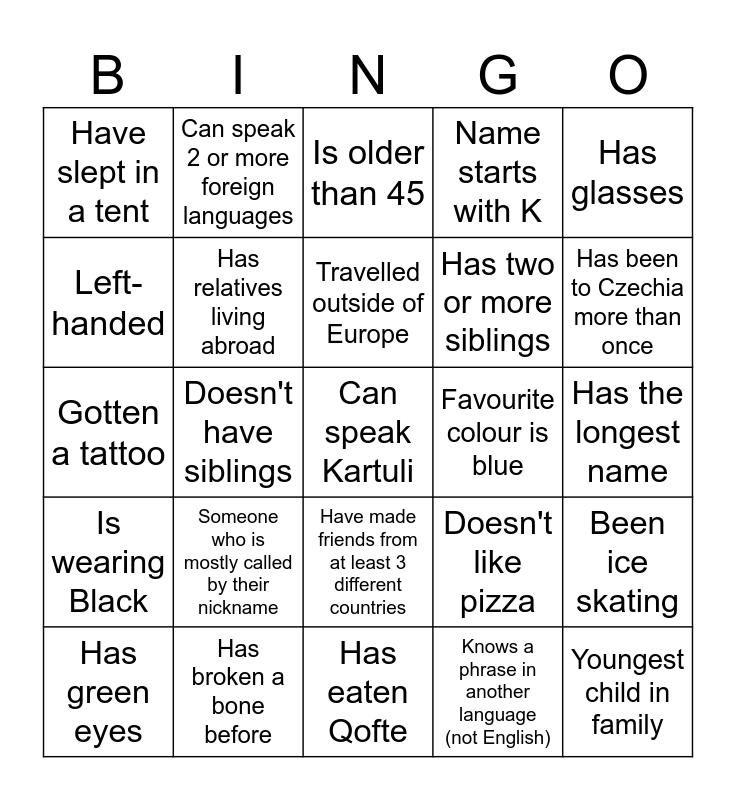 This bingo card has 26 words: Have made friends from at least 3 different countries, Knows a phrase in another language (not English), Travelled outside of Europe, Has broken a bone before, Has glasses, Have slept in a tent, Left-handed, Can speak 2 or more foreign languages, Has the longest name, Doesn't like pizza, Has two or more siblings, Gotten a tattoo, Been ice skating, Has green eyes, Doesn't have siblings, Likes to get up early, Name starts with K, Is wearing Black, Is older than 45, Can speak Kartuli, Has been to Czechia more than once, Has eaten Qofte, Favourite colour is blue, Someone who is mostly called by their nickname, Has relatives living abroad and Youngest child in family.