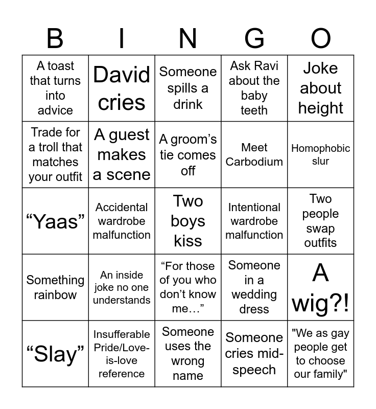 This bingo card has a free space and 32 words: Someone cries mid-speech, Something breaks, Accidental wardrobe malfunction, Two boys kiss, Something rainbow, A guest makes a scene, Joke about height, A wig?!, David cries, Audio issues, A groom’s tie comes off, Someone spills a drink, “Ha–GAY!”, Religious trauma, Intentional wardrobe malfunction, “Werk”, “Slay”, “Yaas”, “For those of you who don’t know me…”, An inside joke no one understands, Someone in a wedding dress, A phone wasn’t on silent, Two people swap outfits, Insufferable Pride/Love-is-love reference, "We as gay people get to choose our family", Ask Ravi about the baby teeth, Meet Carbodium, Trade for a troll that matches your outfit, A toast that turns into advice, Someone uses the wrong name, “I’ll keep this short” and Homophobic slur.