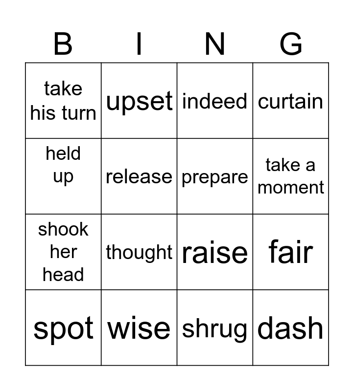 This bingo card has 16 words: wise, fair, indeed, take his turn, shook her head, upset, raise, shrug, held up, release, spot, curtain, thought, take a moment, prepare and dash.
