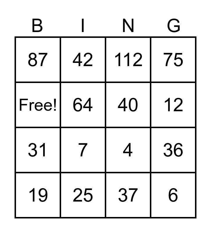 This bingo card has 16 words: 25, 36, 112, 87, 31, 42, 4, 37, Free!, 64, 19, 75, 7, 12, 40 and 6.