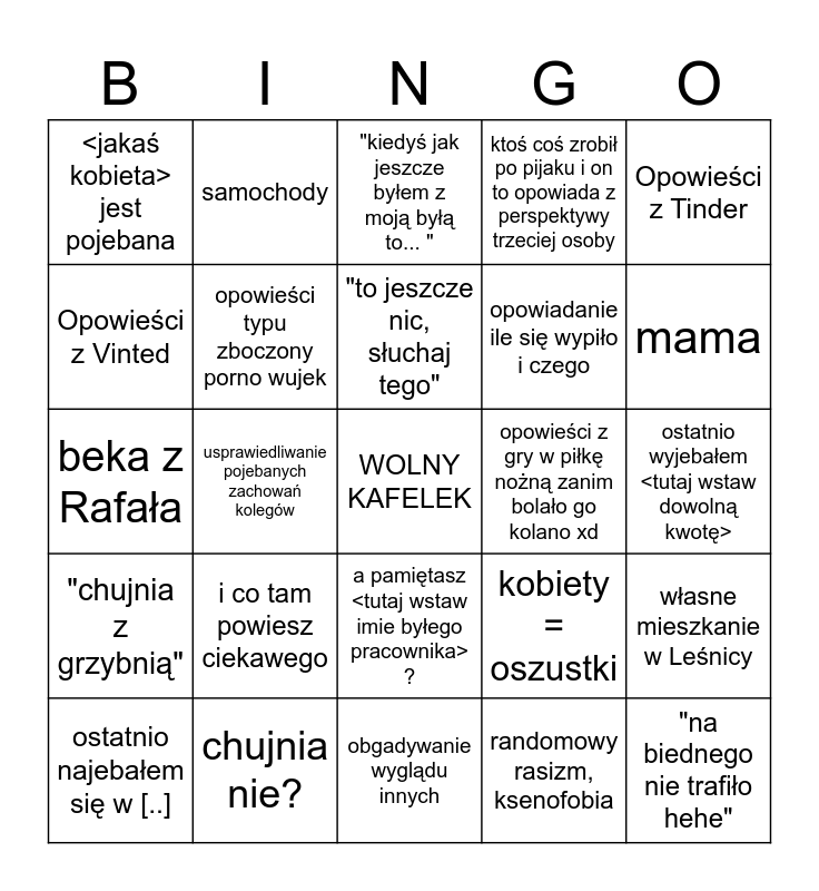 This bingo card has a free space and 24 words: i co tam powiesz ciekawego, chujnia nie?, "to jeszcze nic, słuchaj tego", ostatnio najebałem się w [..], Opowieści z Tinder, <jakaś kobieta> jest pojebana, Opowieści z Vinted, samochody, opowieści z gry w piłkę nożną zanim bolało go kolano xd, a pamiętasz <tutaj wstaw imie byłego pracownika> ?, opowiadanie ile się wypiło i czego, beka z Rafała, kobiety = oszustki, własne mieszkanie w Leśnicy, opowieści typu zboczony porno wujek, randomowy rasizm, ksenofobia, ostatnio wyjebałem <tutaj wstaw dowolną kwotę>, "kiedyś jak jeszcze byłem z moją byłą to... ", mama, usprawiedliwanie pojebanych zachowań kolegów, "na biednego nie trafiło hehe", "chujnia z grzybnią", ktoś coś zrobił po pijaku i on to opowiada z perspektywy trzeciej osoby and obgadywanie wyglądu innych.