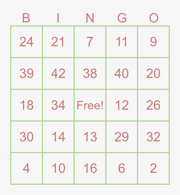 This bingo card has 1 images, a free space and 42 words: 1, 2, 3, 4, 5, 6, 7, 8, 9, 10, 11, 12, 13, 14, 15, 16, 17, 18, 19, 20, 21, 22, 23, 24, 25, 26, 27, 28, 29, 30, 31, 32, 33, 34, 35, 36, 37, 38, 39, 40, 41 and 42.