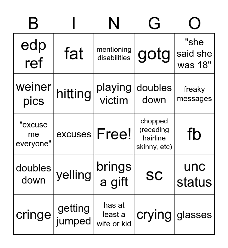 This bingo card has a free space and 24 words: cringe, yelling, playing victim, crying, "she said she was 18", edp ref, fat, mentioning disabilities, chopped (receding hairline skinny, etc), fb, "excuse me everyone", hitting, sc, unc status, weiner pics, getting jumped, has at least a wife or kid, gotg, freaky messages, doubles down, excuses, brings a gift, doubles down and glasses.