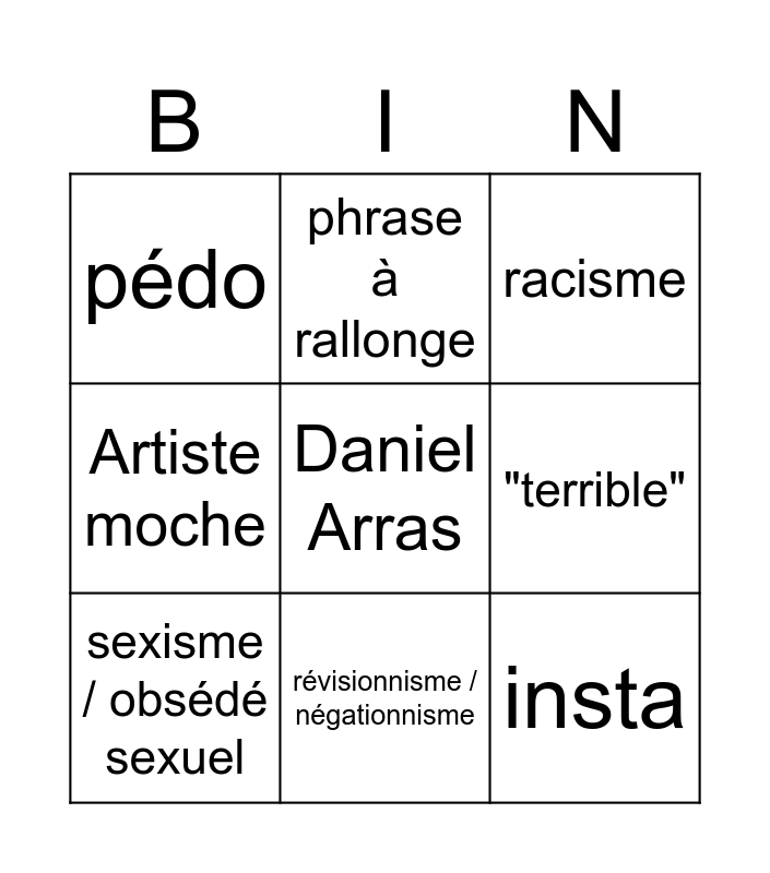This bingo card has a free space and 8 words: "terrible", racisme, phrase à rallonge, sexisme / obsédé sexuel, pédo, insta, Artiste moche and révisionnisme / négationnisme.