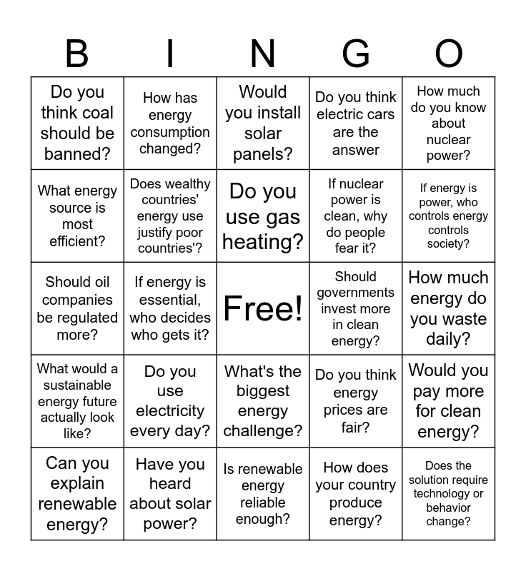 This bingo card has a free space and 24 words: Do you use electricity every day?, Have you heard about solar power?, Do you use gas heating?, Can you explain renewable energy?, How much do you know about nuclear power?, Do you think coal should be banned?, What energy source is most efficient?, How has energy consumption changed?, Should governments invest more in clean energy?, What's the biggest energy challenge?, If nuclear power is clean, why do people fear it?, Should oil companies be regulated more?, Do you think energy prices are fair?, Would you pay more for clean energy?, Does wealthy countries' energy use justify poor countries'?, How does your country produce energy?, How much energy do you waste daily?, Would you install solar panels?, If energy is power, who controls energy controls society?, If energy is essential, who decides who gets it?, Does the solution require technology or behavior change?, What would a sustainable energy future actually look like?, Do you think electric cars are the answer and Is renewable energy reliable enough?.