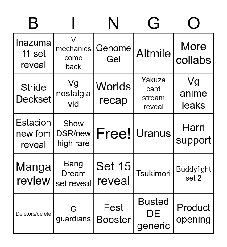 This bingo card has a free space and 24 words: Bang Dream set reveal, G guardians, Worlds recap, Deletors/delete, More collabs, Inazuma 11 set reveal, Stride Deckset, V mechanics come back, Uranus, Set 15 reveal, Yakuza card stream reveal, Estacion new fom reveal, Tsukimori, Buddyfight set 2, Vg nostalgia vid, Busted DE generic, Harri support, Genome Gel, Vg anime leaks, Show DSR/new high rare, Product opening, Manga review, Altmile and Fest Booster.