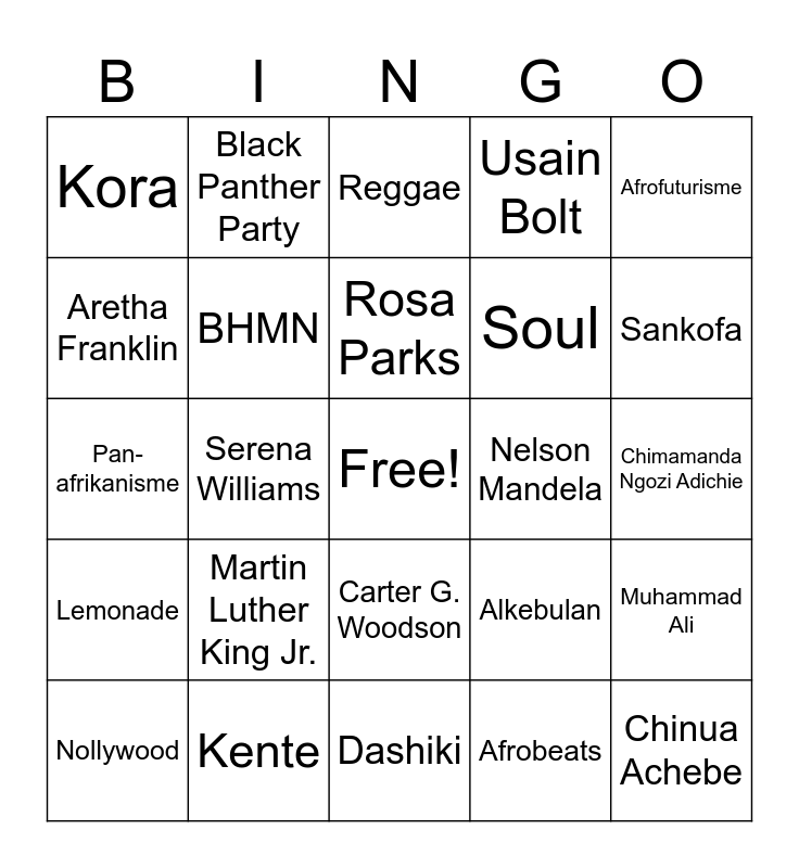 This bingo card has a free space and 24 words: Martin Luther King Jr., Kente, Rosa Parks, Nollywood, Afrofuturisme, Kora, Aretha Franklin, Black Panther Party, Nelson Mandela, Carter G. Woodson, Soul, Pan-afrikanisme, Alkebulan, Muhammad Ali, BHMN, Afrobeats, Chimamanda Ngozi Adichie, Reggae, Sankofa, Serena Williams, Chinua Achebe, Lemonade, Usain Bolt and Dashiki.