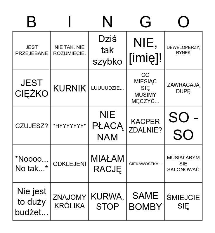 This bingo card has a free space and 24 words: ODKLEJENI, ZNAJOMY KRÓLIKA, LUUUUDZIE..., Nie jest to duży budżet..., DEWELOPERZY, RYNEK, JEST PRZEJEBANE, JEST CIĘŻKO, NIE TAK. NIE ROZUMIECIE., KACPER ZDALNIE?, MIAŁAM RACJĘ, CO MIESIĄC SIĘ MUSIMY MĘCZYĆ..., CZUJESZ?, CIEKAWOSTKA..., MUSIAŁABYM SIĘ SKLONOWAĆ, KURNIK, SAME BOMBY, SO - SO, Dziś tak szybko, ZAWRACAJĄ DUPĘ, *HYYYYYYY*, ŚMIEJCIE SIĘ, *Noooo... No tak...*, NIE, [imię]! and KURWA, STOP.