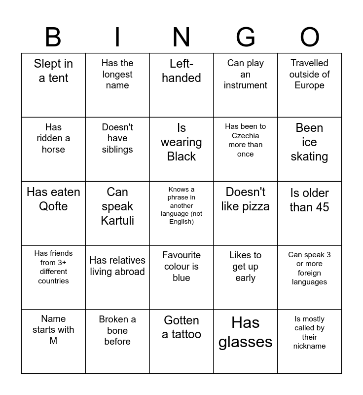 This bingo card has 25 words: Has friends from 3+ different countries, Broken a bone before, Knows a phrase in another language (not English), Has glasses, Travelled outside of Europe, Slept in a tent, Has the longest name, Left-handed, Doesn't like pizza, Can speak 3 or more foreign languages, Has ridden a horse, Doesn't have siblings, Gotten a tattoo, Likes to get up early, Been ice skating, Name starts with M, Can speak Kartuli, Is wearing Black, Has been to Czechia more than once, Is older than 45, Has eaten Qofte, Has relatives living abroad, Favourite colour is blue, Can play an instrument and Is mostly called by their nickname.