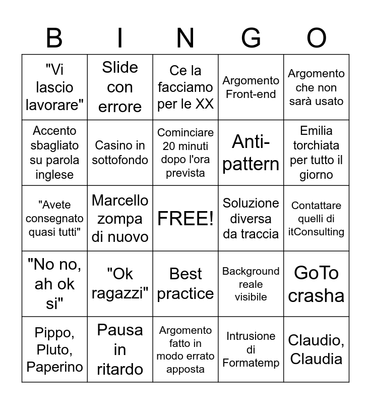 This bingo card has a free space and 24 words: "Ok ragazzi", Pausa in ritardo, Cominciare 20 minuti dopo l'ora prevista, Pippo, Pluto, Paperino, Argomento che non sarà usato, "Vi lascio lavorare", Accento sbagliato su parola inglese, Slide con errore, Soluzione diversa da traccia, Best practice, Anti-pattern, "Avete consegnato quasi tutti", Background reale visibile, GoTo crasha, Casino in sottofondo, Intrusione di Formatemp, Contattare quelli di itConsulting, Ce la facciamo per le XX, Emilia torchiata per tutto il giorno, Marcello zompa di nuovo, Claudio, Claudia, "No no, ah ok si", Argomento Front-end and Argomento fatto in modo errato apposta.